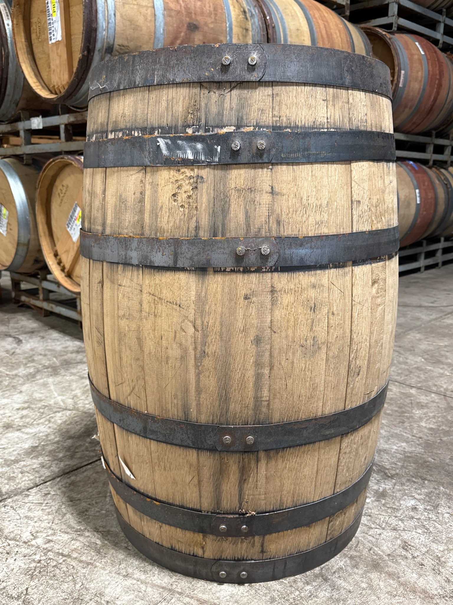 53g super clean and nice bourbon barrels head bunged. These Bulleit Bourbon barrels held beer previously. Bands are tight and barrels are clean, never been outside and will make a great whiskey cabinet, display barrel, display in your man cave or deck or gift. Taking orders now to ship to your home/business and will sell out with this rare side stencil/logo. 35in tall 25in wide. American Oak barrel. Cut them in half to make planters.